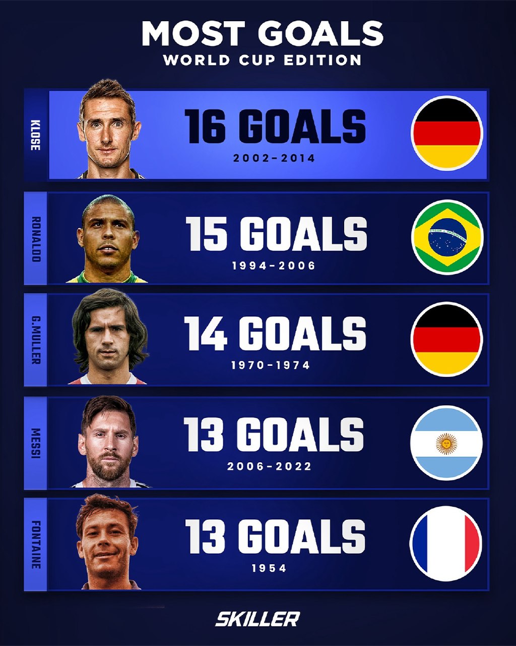 میروسلاو کلوزه با ثبت ۱۶ گل در جامهای جهانی، به عنوان آقای گلِ تمام ادوار شناخته میشود. او این رکورد را در طول چهار دورهٔ حضور در جام جهانی با ثبات و دقت موقعیتگیری به دست آورد. کلوزه به خاطر ضربات سر قوی و حضور در محوطهٔ کوچک حریفان بسیار مشهور بود و گلهایش اغلب در بازیهای حساس اهمیت داشت. او در تیم ملی آلمان نقشی کلیدی در قهرمانی ۲۰۱۴ ایفا کرد و عملکردش در مراحل حذفی بارها تعیینکننده بود. ثبات، تجربهٔ طولانی و آمادگی در لحظات دشوار، ویژگیهای بارز کارنامهٔ کلوزهاند.