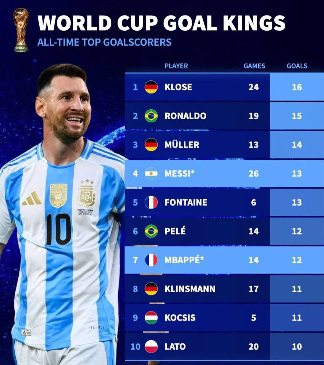 لیونل مسی با ۱۳ گل در جام جهانی سهم قابلتوجهی در تاریخ مسابقات دارد و این آمار در کنار قهرمانی ۲۰۲۲ اعتبارش را بیشتر کرده است. مسی علاوه بر گلزنی، در خلق موقعیت، پاس گل و مدیریت بازی نقش محوری داشته که او را از یک گلزن صرف متمایز میکند. حضور طولانیمدت و تأثیر او در بازیهای حیاتی باعث شده نامش در کنار بزرگانی چون پله و رونالدو قرار گیرد. سبک تکنیکی و دید بازیِ مسی او را به یکی از کاملترین مهاجمان تاریخ تبدیل کرده است. تحلیل عملکرد مسی نشان میدهد که او در ترکیب آمار و بازیسازی یک نمونهٔ بینظیر است.