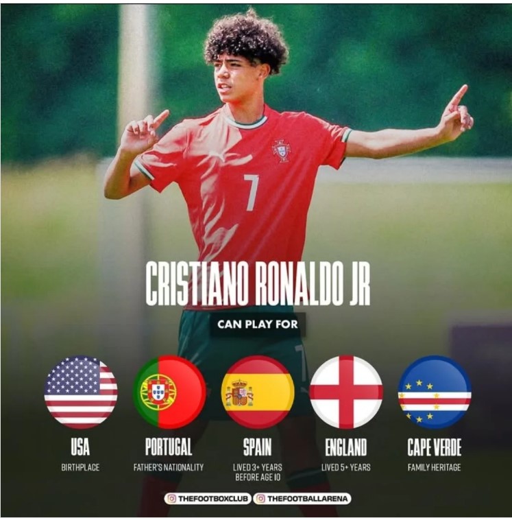 طبق اخبار فوتبال کریستیانو جونیور، پسر کریستیانو رونالدو، در موقعیتی منحصربهفرد قرار دارد که میتواند برای پنج کشور مختلف بازی کند. او تابعیت پرتغال، محل تولدش آمریکا و سابقه زندگی در انگلستان و اسپانیا را دارد. همچنین به واسطه ریشه خانوادگی، حق بازی برای کیپ ورد را هم دارد. انتخاب نهایی او میتواند آینده فوتبالیاش را رقم بزند.