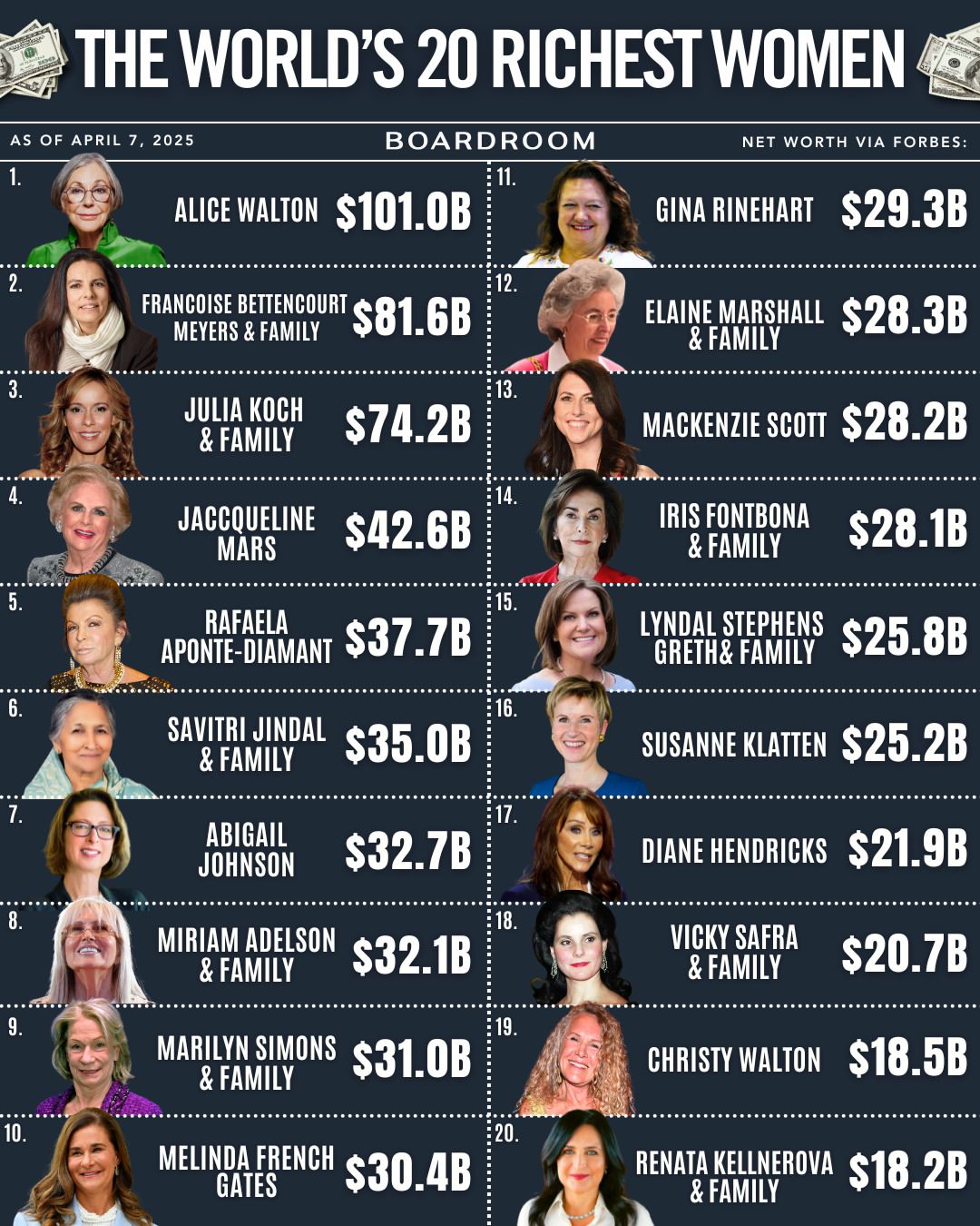 لیست زنان ثروتمند ۲۰۲۵ ترکیبی از وارثان امپراتوریهای خانوادگی و مدیران موفق کسبوکار است. آلیس والتون همچنان در رتبه نخست قرار دارد. در کنار او زنان دیگری از حوزههای مد، تکنولوژی و لوازم آرایشی حضور دارند. این لیست نمادی از رشد نقش زنان در اقتصاد جهانی است.