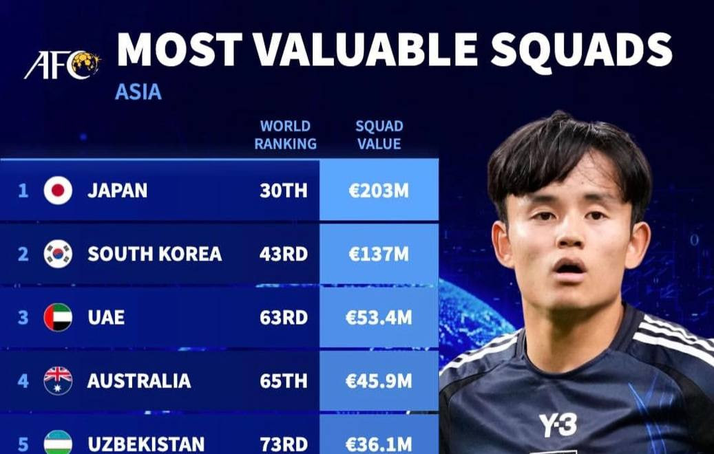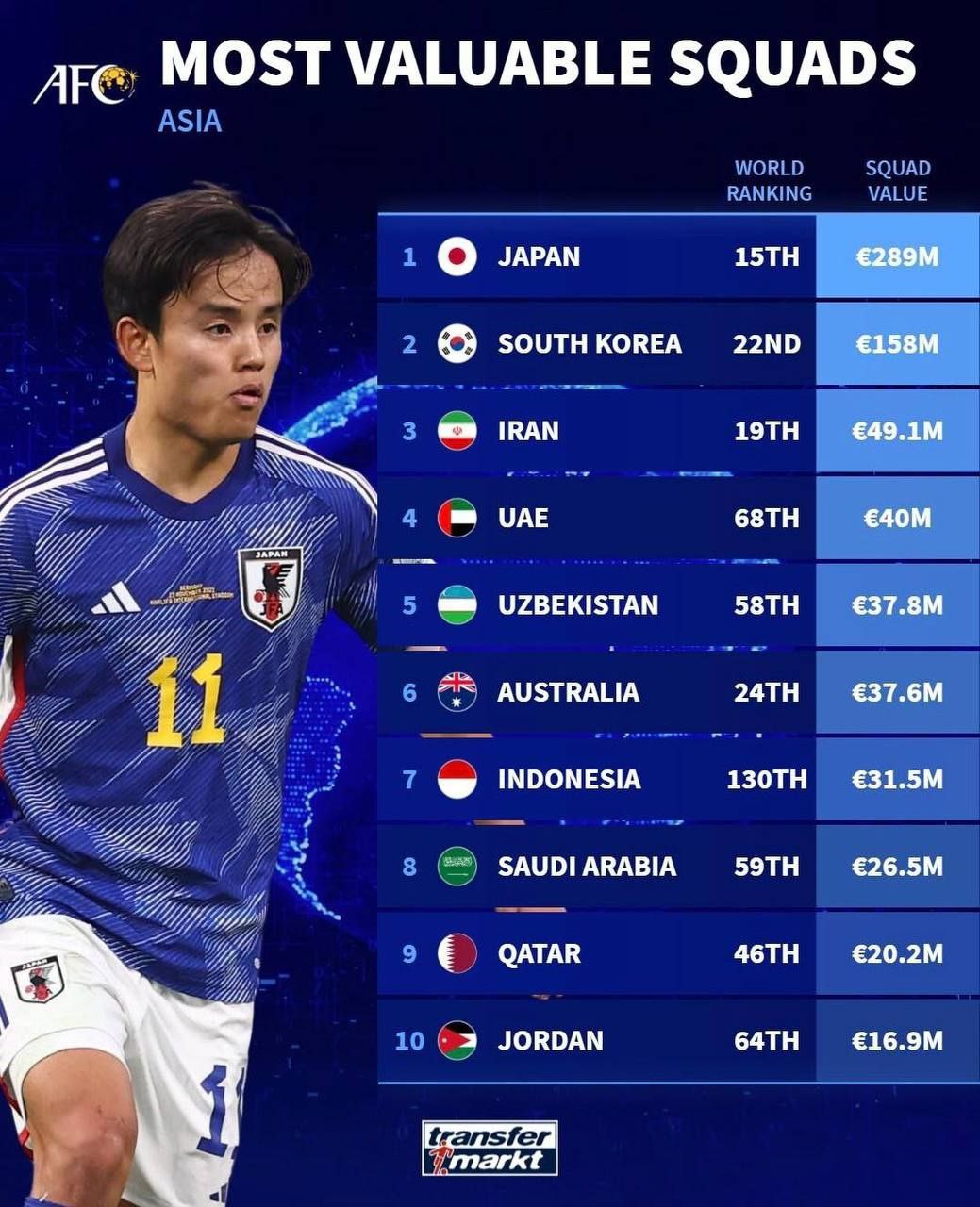تیم ملی ژاپن گرانترین تیم ملی آسیا محسوب میشود و بازیکنانش در لیگهای معتبر اروپا بازی میکنند. ارزش بازیکنان ژاپن میلیونها یورو است و این تیم در ترانسفرمارکت همیشه در صدر قرار دارد. سازماندهی حرفهای و استراتژی بلندمدت باعث شده ژاپن الگوی موفق آسیا باشد. ایران میتواند با الگوبرداری از ژاپن جایگاه خود را ارتقا دهد.